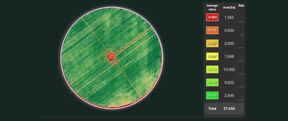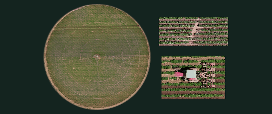 المراقبة الجوية لصحة المحاصيل، تحديد بؤر انتشار الحشائش، وفحص كفاءة أنظمة الري المحوري وكشف التسربات.