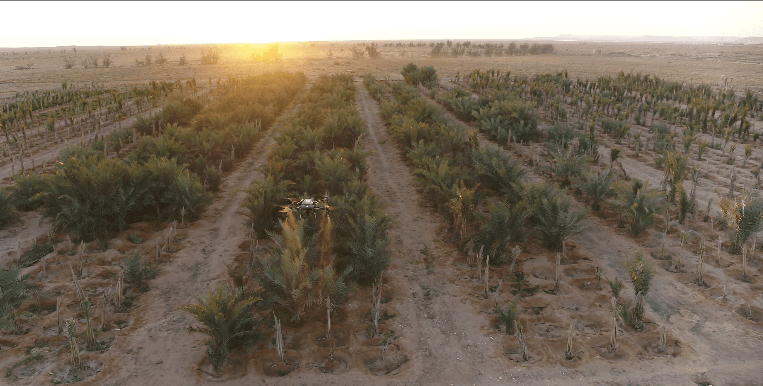 التحليل التاريخي لصحة النخيل، خرائط رطوبة التربة، تقدير المحصول، وتجارب المكافحة الجوية لآفات النخيل (حلم الغبار) والرش الجوي الوقائي لسوسة النخيل.